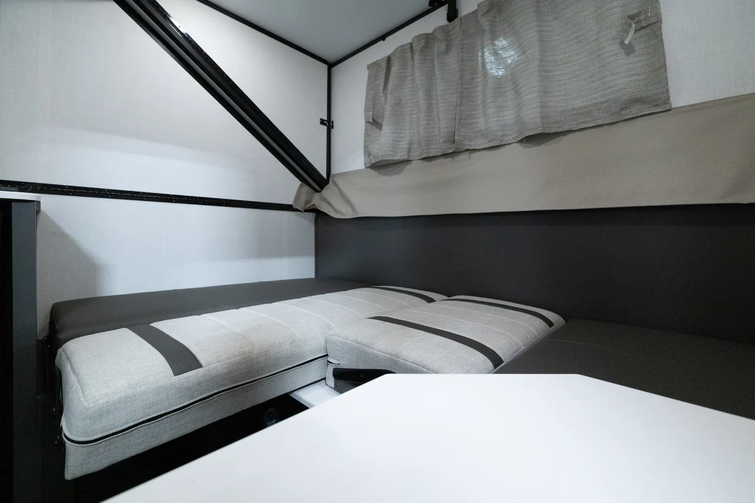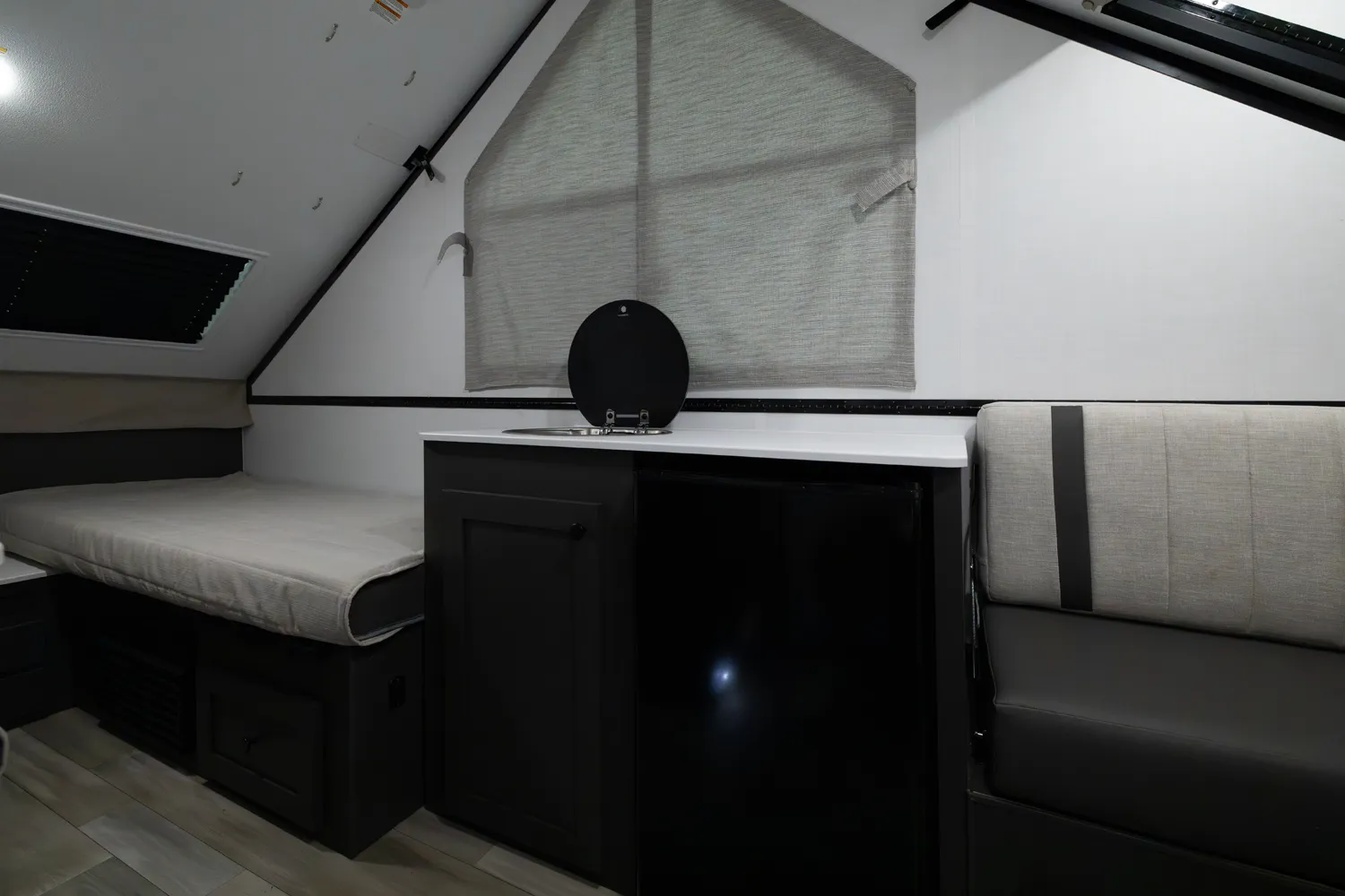 The Flagstaff Hard Side T21HS delivers smart comfort in a compact design. A front dormer provides increased head height above the front dinette, which easily converts to sleeping space. Inside you’ll find a convenient wet bath, cooktop, and sink, while the rear features twin bed platforms with a king bed insert option. An easy-reach front storage trunk adds extra convenience for gear on every adventure.