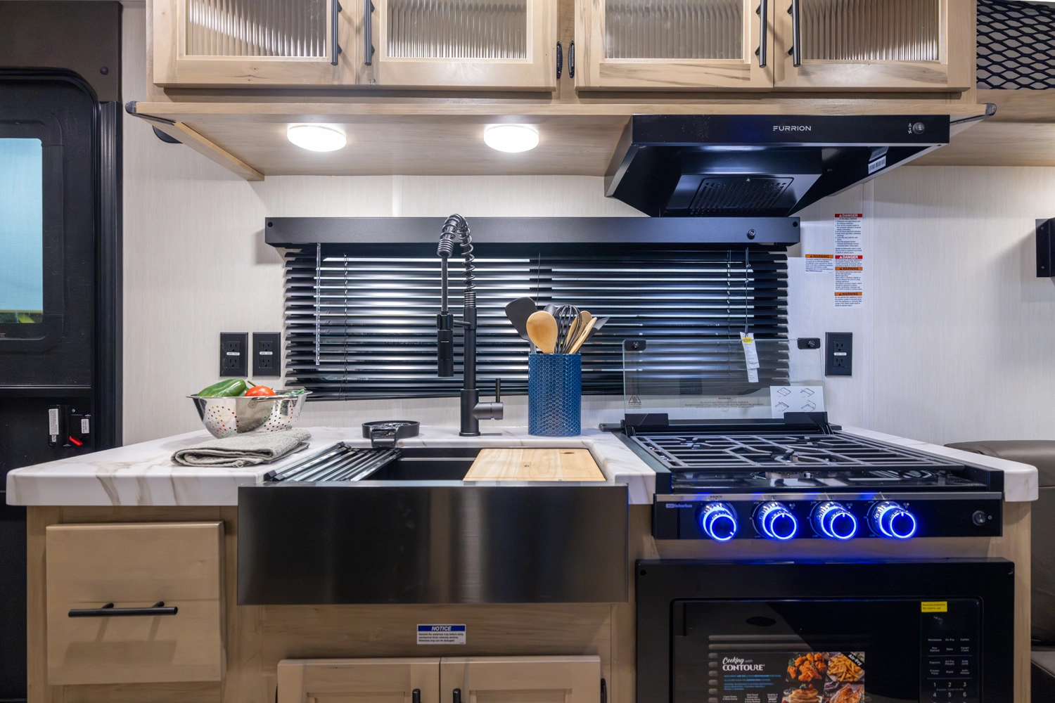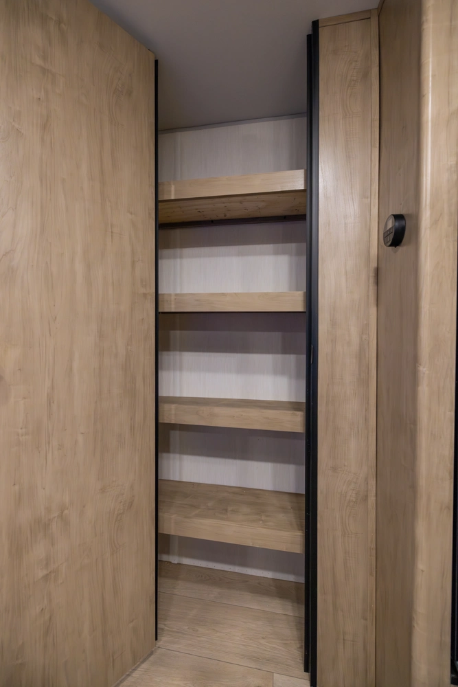 The Cherokee Grey Wolf 22RR by Forest River is the ultimate RV for outdoor enthusiasts. The spacious toy hauler garage, with a convertible rear ramp, provides ample space for toys and gear. The outdoor kitchen, shower, and patio area offer a luxurious outdoor living experience. Inside, you'll find a comfortable bedroom with a walk-around queen bed and a well-appointed bathroom. The modern kitchen, with its black stainless steel farm sink and sink cover, is perfect for cooking and entertaining.