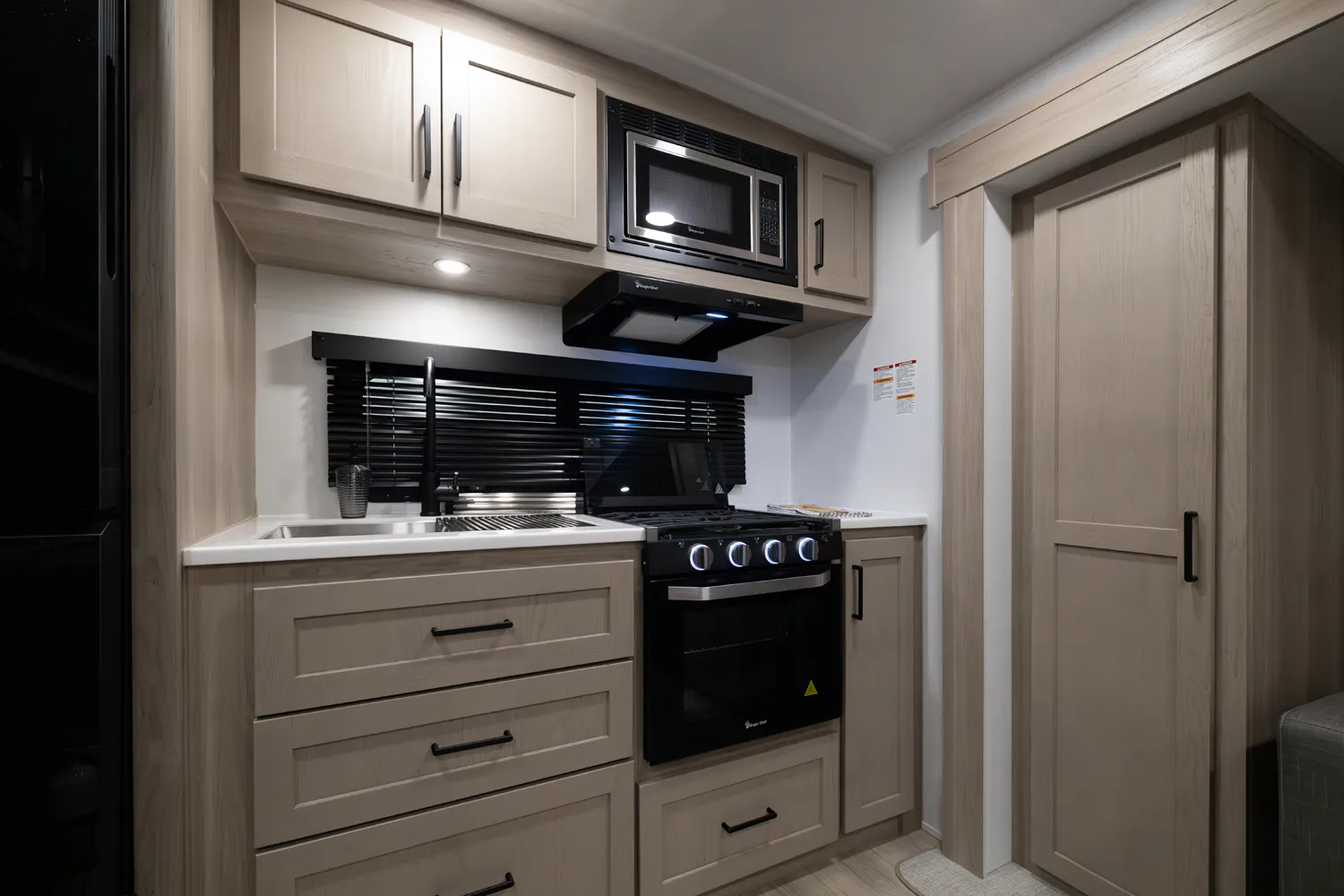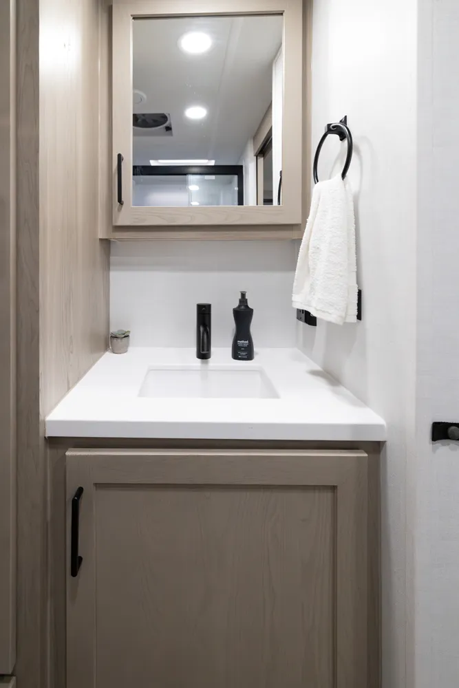 The 2515S offers a spacious convenient layout with two entry doors providing easy access to the kitchen, bedroom, and bathroom, all while the slides are retracted. The rear kitchen features ample counter space while the living area includes a U-shaped dinette and theater seating. (optional hide-a-bed) The wardrobe slide adds generous storage making this a perfect choice for families or couples seeking flexibility and functionality on the road.
