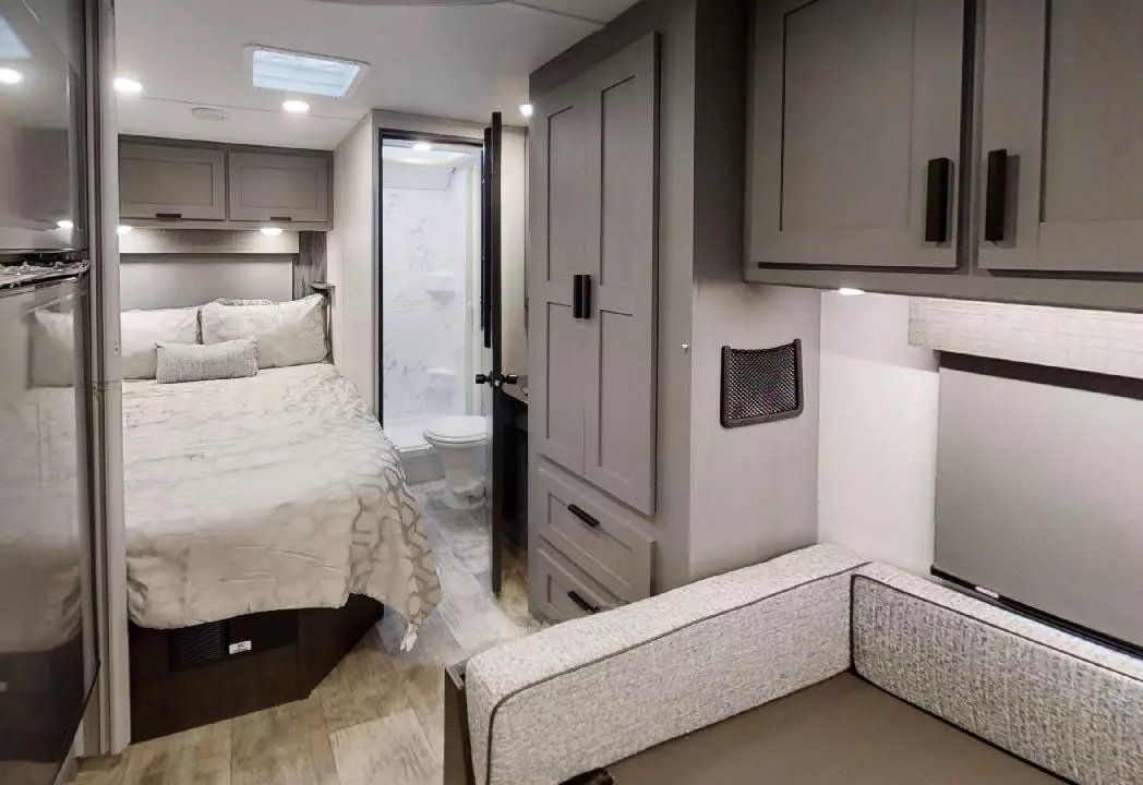 The Solera 22N is built on the Ford E350 chassis. Start traveling in true luxury with this motorhome! The corner queen bed offers a comfortable night's rest, and is conveniently next to the rear corner bathroom which has a 24" x 32" shower and a vanity sink just outside. The kitchen area is fully equipped for meals on the go, with a 10.7 cu ft 12V refrigerator, recessed 3-burner range with flush glass cover, and a 1.3 cu ft convection microwave oven. Overhead cabinets provide ample storage. This model includes the ever-popular U-shaped dinette, which transforms into an extra sleeping space too. The 60" x 80" bunk over cab also offers yet another sleeping spot with LED TV for entertainment.